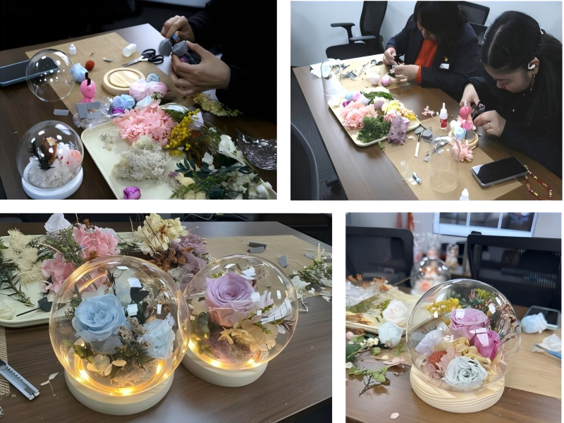 本次活动于2026年3月4日下午在公司大会议室举行。活动开始,专业的花艺老师为大家详细讲解了永生花的特点、制作工艺以及玻璃罩饰品的搭配技巧和设计理念。女职工们全神贯注地聆听,不时提出疑问和想法,与老师积极互动交流。随即,大家便投入到创作中。她们充分发挥自己的想象力和创造力,精心挑选花材,巧妙搭配色彩,将一朵朵永生花在玻璃罩内错落有致地摆放,再点缀上可爱的玩偶等饰品,每一个细节都倾注了她们的创意与热情。